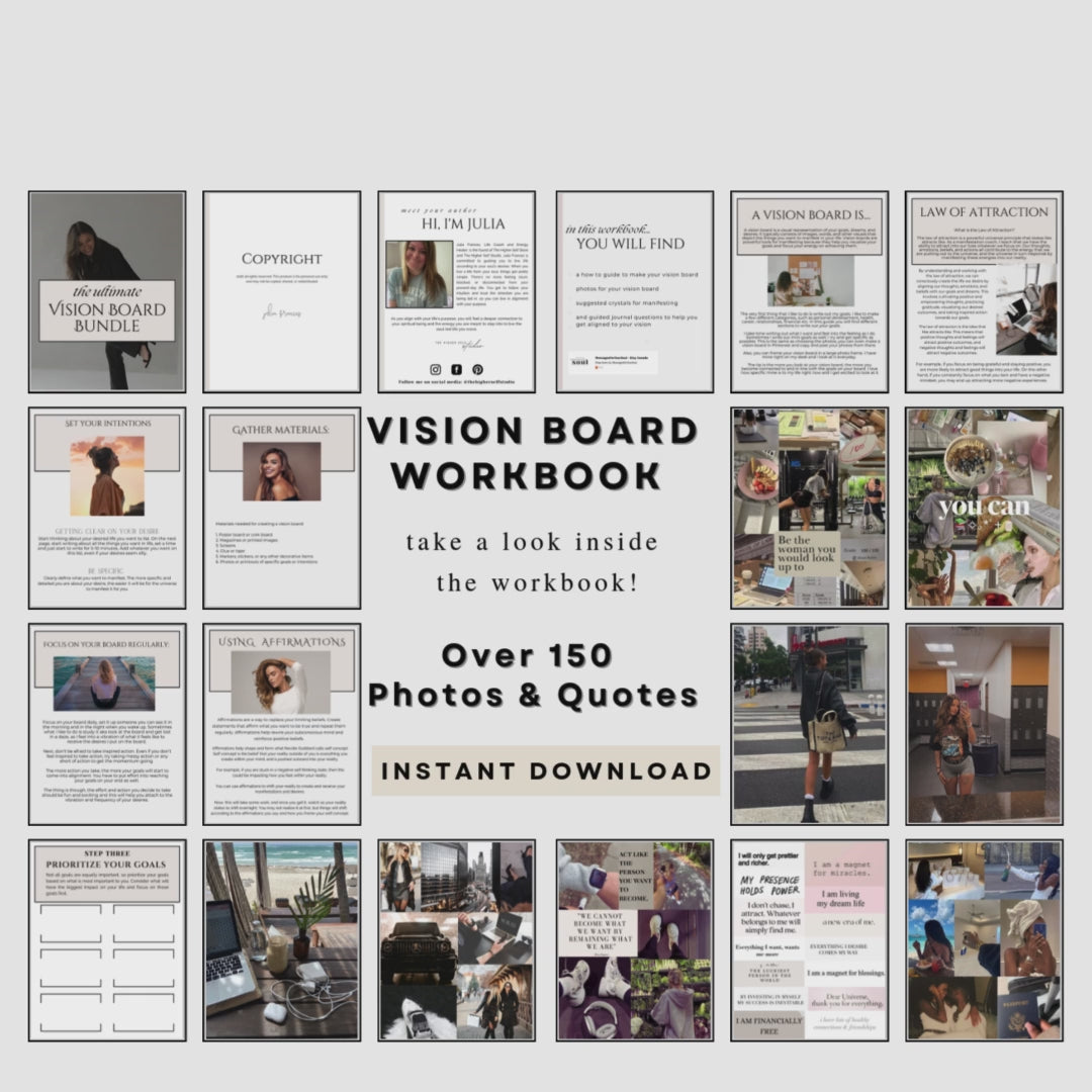 The Ultimate Vision Board Bundle is a simple and supportive manifestation workbook set that helps you connect with your Higher Self, set clear goals, and create your dream life. This digital bundle includes a guided vision board workbook, 100 journaling questions, and 150+ aesthetic vision board images to help you build confidence, strengthen your mindset, and stay inspired on your personal growth and manifestation journey.